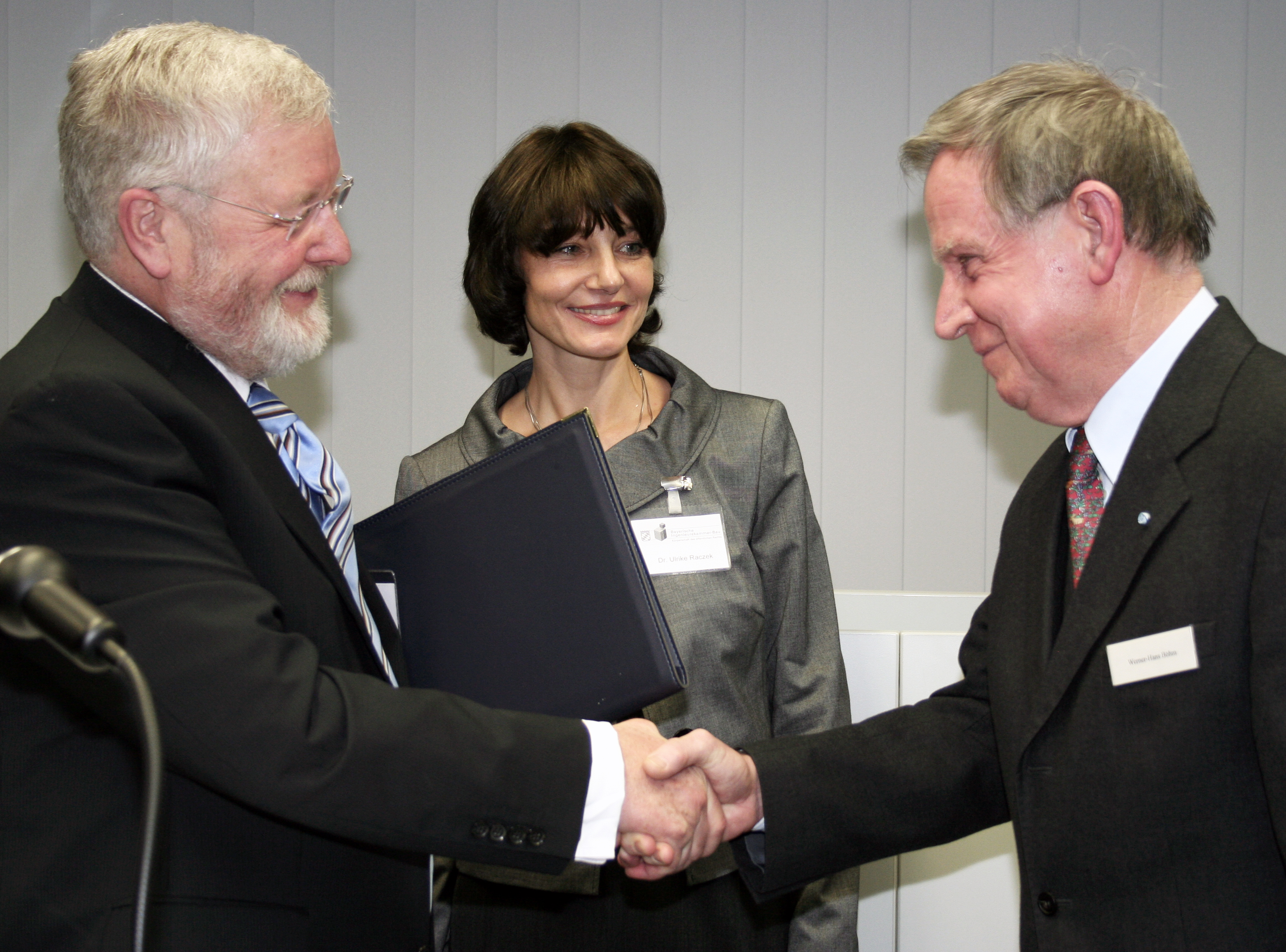 Mit der Ehrenmedaille, der höchsten Auszeichnung der Bayerischen Ingenieurekammer-Bu ist Regierungspräsident a.D. Werner-Hans Böhm ausgezeichnet worden. Das Foto zeigt Kammerpräsident Dr.-Ing. ´Heinrich Schroeter, Geschäftsführerin Dr. Ulrike Raczek und Regierungspräsident a.D. Werner-Hans Böhm (r.). ► Download [jpg, 4,01MB] |