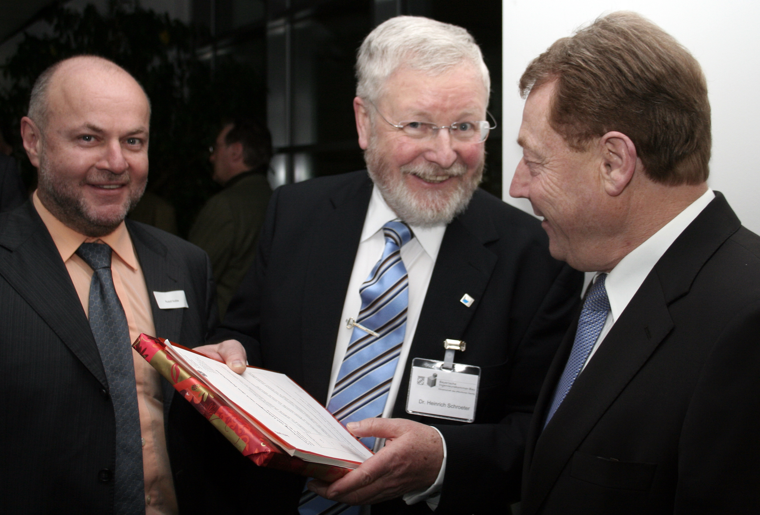Dipl.-Ing. Rudolf Kolbe, Präsident der Kamer der Architekten und Ingenieurkonsulenten für Oberösterreich und Salzburg, Kammerpräsident Dr.-Ing. Heinrich Schroeter und Ministerialdirektor Dipl.-Ing. Josef Poxleitner (Oberste Baubehörde im Bayer. Staatsministerium des Innern). ► Download [jpg, 3,21 KB] |